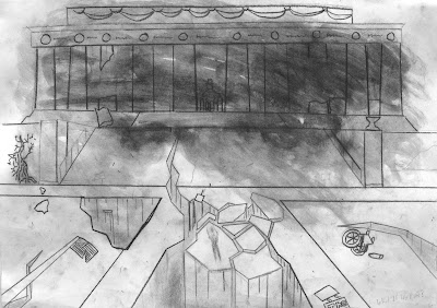 i think it turn out very well considering that the black smudge was supposed to be a lot less noticeable. in the end i actually like it now that i can see it on a smaller scale considering i couldn't take in all of the picture at once. the black smudge represents the pollution that was left behind the wheel chair abandonment and the torn flag shows what we once held high has been toppled over. the crack poses an interesting idea of how the earth would die without us.