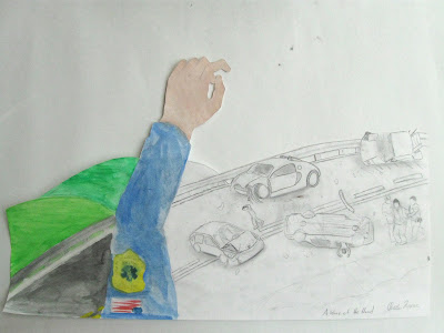 my goals for this project were to represent the hard things that EMTs see during their calls. my project called a wave of the hand is imagining that with a wave of the hand the hardships disappear thats why one side is colorful and represents all thats good.